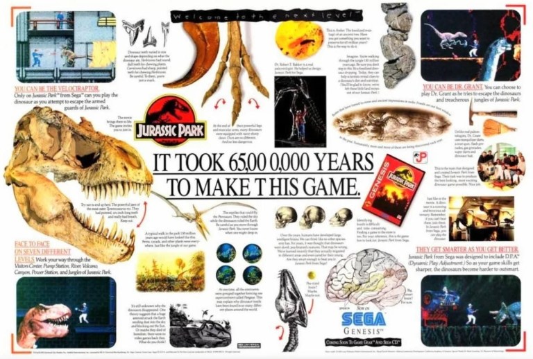 Sega acquired licenses to make Jurassic Park games for its existing consoles plus the arcade game. To promote the Sega Genesis JP game, Sega came up with this 2-page print ad with a great visual design. While there were only few screenshots from the video game, the rest of the ad was filled with lots of eye candy such as dinosaur fossils, illustrations, science-based details and more. Very clearly, this print ad strongly emphasized the dinosaurs, adventure and intrigue. The game eventually sold a lot of copies and added to the overall commercial success Sega had in North America in 1993.