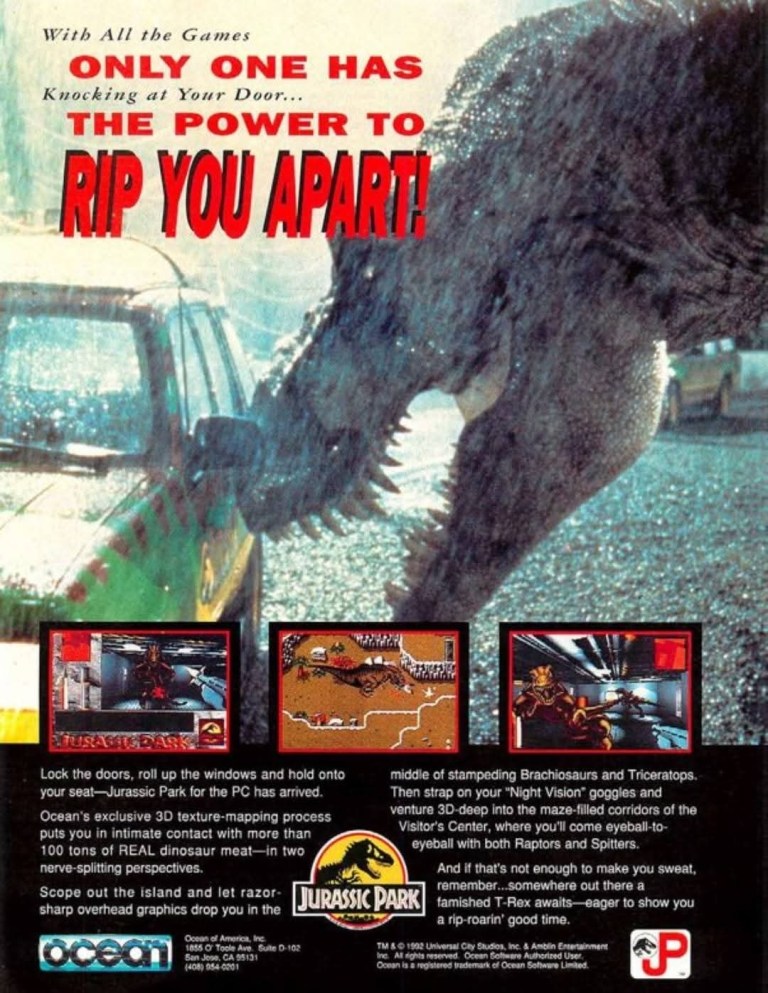 For the Jurassic Park personal computer (PC) game, Ocean came up with a single-page print ad that uses a live-action image from the film’s production. Not only was the image of Tyrannosaurus Rex head (with its sharp teeth visible) touching the vehicle very engaging to see, it is also a reminder that practical effects and other physical stuff were heavily used to do it resulting in a high level of realism that computer-generated imagery (CGI) cannot match.