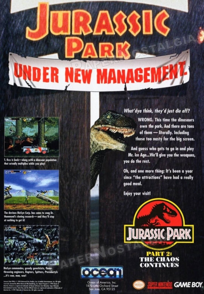While it is a fact that the sequel to Jurassic Park did not come out in book format (1995) and in the cinemas (1997), Ocean went ahead with its very own sequel titles Jurassic Park Part 2: The Chaos Continues. They even had an original tale about the established character Dr. Alan Grant returning to Jurassic Park to stop a rival corporation from taking over the place. To promote the SNES version of the game, the company came up with a single-page print ad that had an “under new management” sign above while showing a Velociraptor and a few screenshots from the game. As it was released in 1994, the game strongly appealed to the fans as well as gamers who enjoyed 2D side-scrolling adventure games on the SNES.