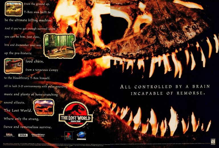 Like its blockbuster predecessor, The Lost World: Jurassic Park had its own video game adaptations. The Lost World: Jurassic Park games for PlayStation and Sega Saturn were developed by a video game company which was under DreamWorks SKG (note: Steven Spielberg was one of the founders), and they had Electronic Arts (EA) and Sega publishing each game per specific console. To market the game, a 2-page print ad was made which featured a dinosaur skull dominating the image leaving some space for screenshots and the descriptive text. Having seen the movie and having played the game, I can say that the dark aesthetic of this print ad reflected the dark and gritty tone of the Spielberg-directed movie.