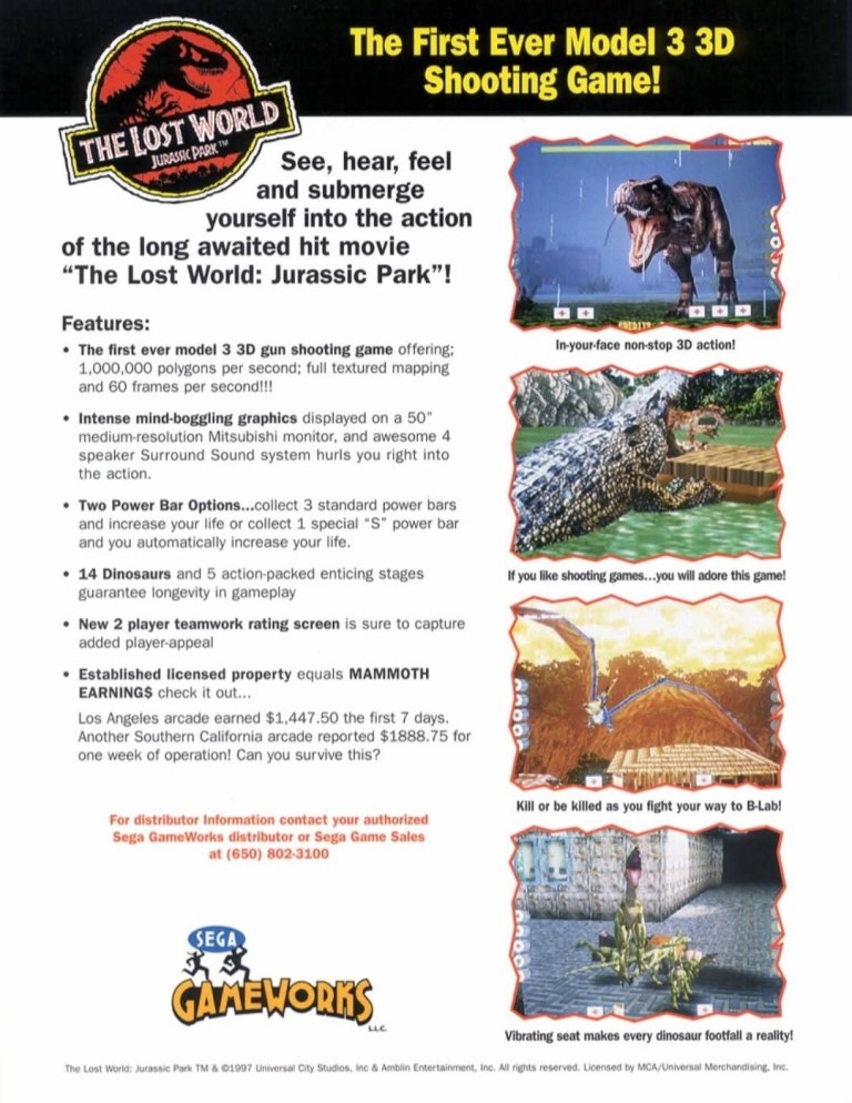 For me, the best game based on The Lost World: Jurassic Park has always been the official arcade game developed and distributed by Sega. It was a sophisticated rail shooter made by the same team behind the 1994 Jurassic Park arcade game. The arcade flyer clearly mentions the Model 3 which was a highly advanced arcade hardware of Sega that made highly detailed 3D polygonal graphics and smooth animation possible. The flyer also boasted the use of a 50-inch medium resolution Mitsubishi monitor and the 4-speaker Surround Sound system that made the arcade experience intense. Even by today’s standards, this 1997 arcade game still looks great and remains enjoyable to play. This arcade flyer really promoted what was real for gamers to experience in the arcade. Are you aware that Steven Spielberg himself received The Lost World: Jurassic Park arcade cabinet as a gift from Sega?