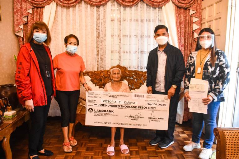 Mayor Jaime Fresnedi (2nd from right) visited Lola Victoria Diamse (center) who celebrated her 100th birthday last October 20 in Brgy. Putatan. Fresnedi turned over the City Government’s financial assistance amounting to P100,000 to Diamse and her family. Muntinlupa City grants cash incentives to city residents reaching 100 years old through the Office of Senior Citizen Affairs (OSCA) headed by Ms. Zeny Celestino (left). Recently, OSCA also led an anti-flu / anti-pneumonia vaccination program for the elderly together with the City Health Office as part of the local response to curb COVID-19. (Source – Muntinlupa PIO)