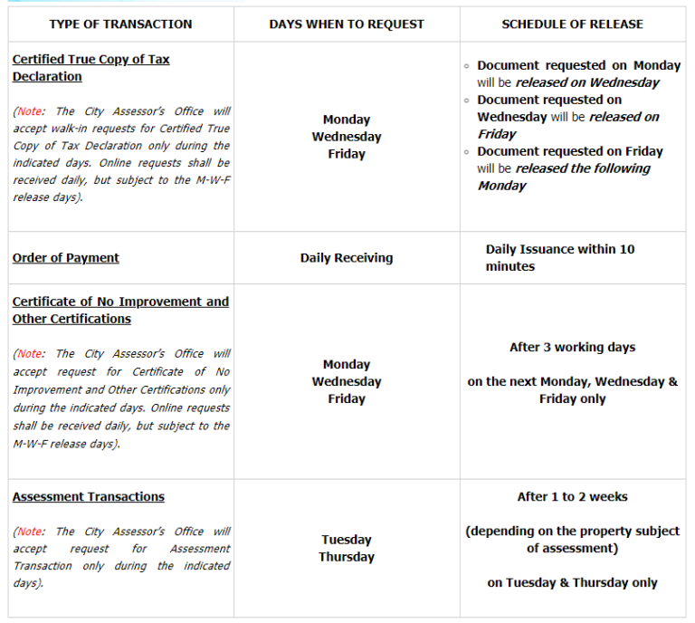 The City Assessor’s Office will accept walk-in requests only during the indicated days per transaction. Online requests shall be received daily but subject to the indicated release days.