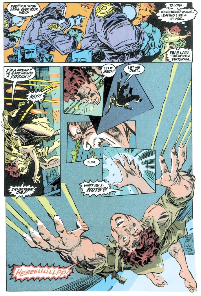 This is a very well-written story by Peter David. While the first issue established Miguel O’Hara’s personality and corporate standing, this one established his becoming Spider-Man 2099 by means of mutation. Not only does he have talons (which retract automatically when he touches his own skin) and sharp teeth, he also gains heightened vision, enhance leaping ability, and most notably his costume (backed with a reasonable explanation it exists). The scenes of corporate intrigue and the introduction of the cyber cowboy named Venture easily added a detective story element into the plot which was quite gripping. No doubt about it, I found the story in this comic book more satisfying than the first issue.