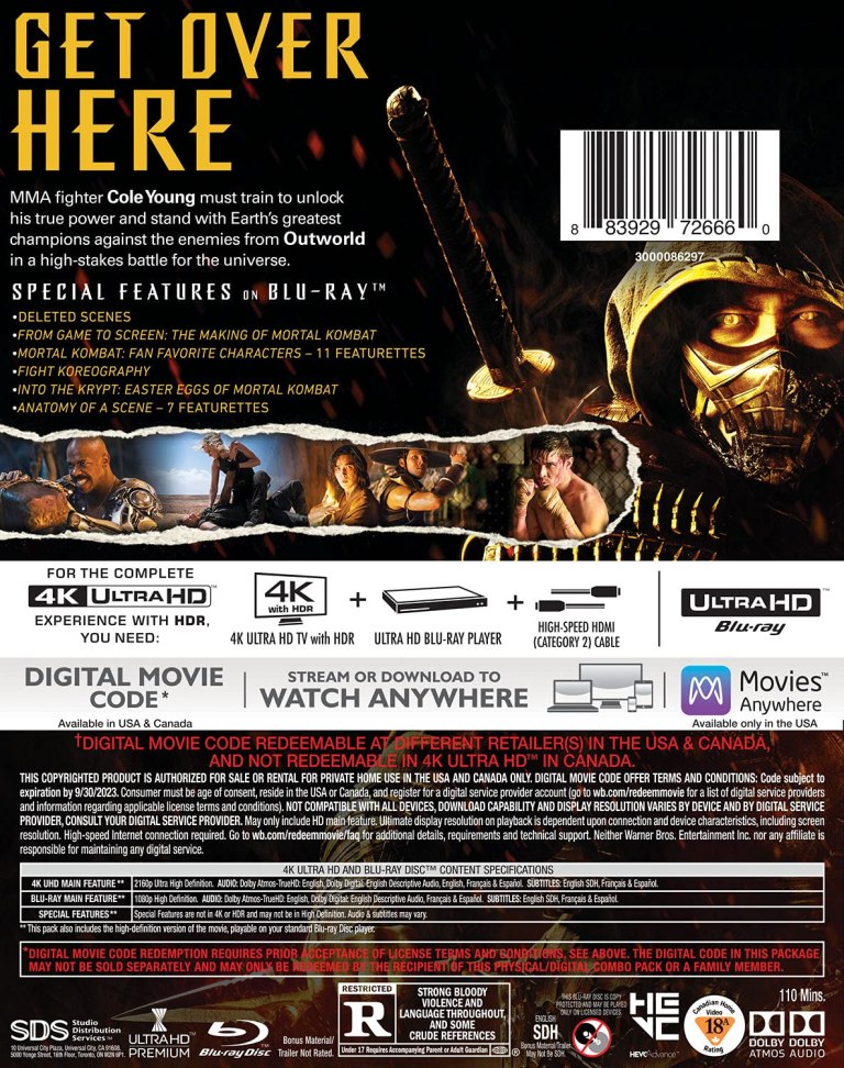 Mortal Kombat (2021) 4K Blu-ray is a combo package that comes with the 4K Blu-ray disc, the Blu-ray disc (for 1080p viewing) and in digital form (via a provided code). The good news for 4K Blu-ray collectors is that the movie’s visuals are rendered in native 4K! To put things in perspective, here are the technical specs and details from Blu-ray.com