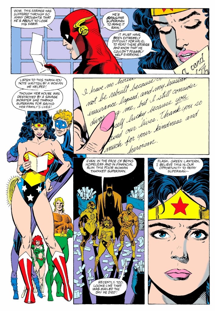 What is most notable here is the scene in which Superman’s super-powered allies visit a local post office that literally got flooded with lots of mail from around the world addressed to the Man of Steel. On face value, such a scenario looked silly but the way Dan Jurgens crafted the dialogue and the images, the post office scene became believable and sensible to read. This shows that superheroes like Aquaman, Wonder Woman, the Flash and others do have hearts to be caring and sensible to the people.