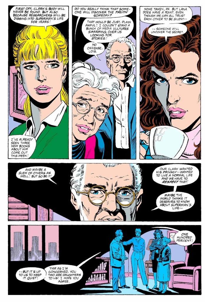 For one thing, this comic book has Lois Lane reunited at last with Clark Kent’s earthly parents Jonathan and Martha which was not only really dramatic but also had very rich dialogue written. By this point in this particular storyline, Lois Lane has gone through waves of deep emotions and pain, while getting stressed with journalistic work. As such, there is this dramatic pay-off that happened during the reunion with the elderly Kent couple.