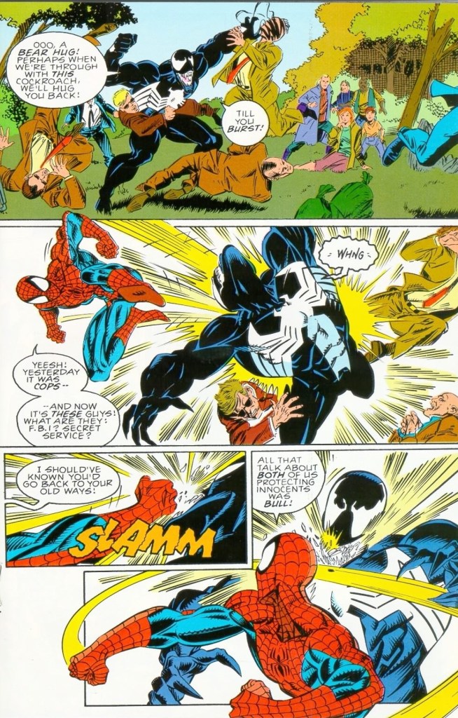 Along the way, the iconic Spider-Man got a rather huge chunk of the spotlight in this comic book making him the 2nd lead next to Venom. I remember back in 1993 when there were Venom fans who complained about Spider-Man literally stealing the thunder away from his greatest enemy while there were a few Spider-Man fans who defended the icon’s guest participation in the story as he has always been linked with Venom’s origin. Considering the lack of depth in the plot, I can say Spider-Man appearance her served as a somewhat helpful filler.