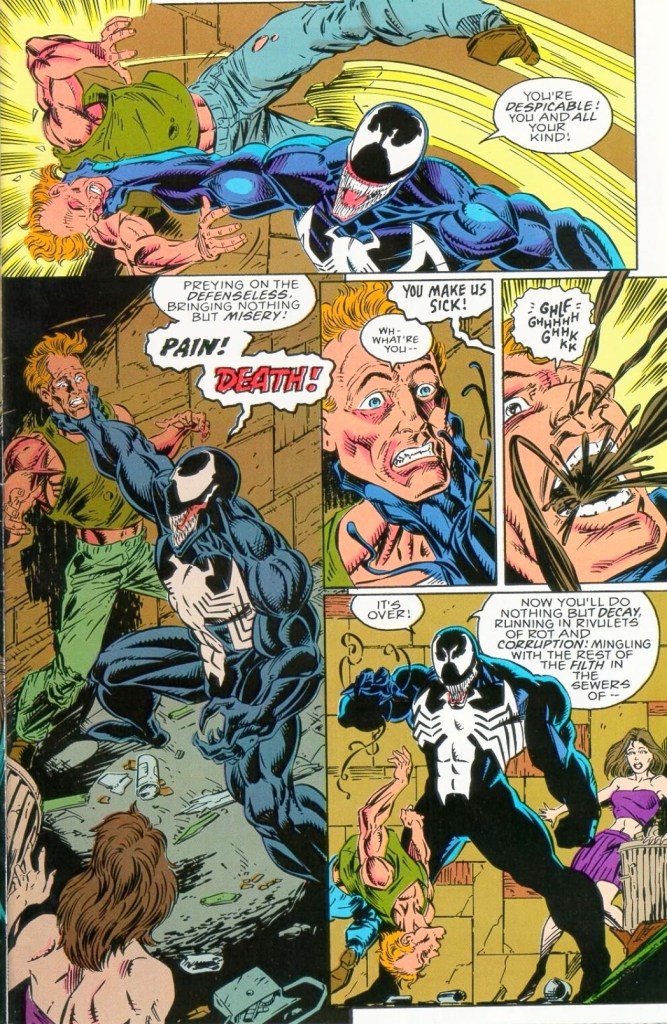 Focusing on the plot, this story took place after the events in Amazing Spider-Man #375 (1993) which was released AFTER this particular comic book. As a standalone Venom story, this one clearly portrays him more of a vigilante in the sense that he goes up against a new force of evil that happens to be pouncing on people that Venom believes to be innocent and powerless. Unsurprisingly, Venom does not seek the help of law enforcers to help the innocent but rather he takes violent action to help the victims, going as far as to kill the so-called bad guys. The bad guys in this story work under a powerful man whose son was killed by Venom a few years prior. Within the context of this comic book, the new force of evil was introduced in subtle ways.