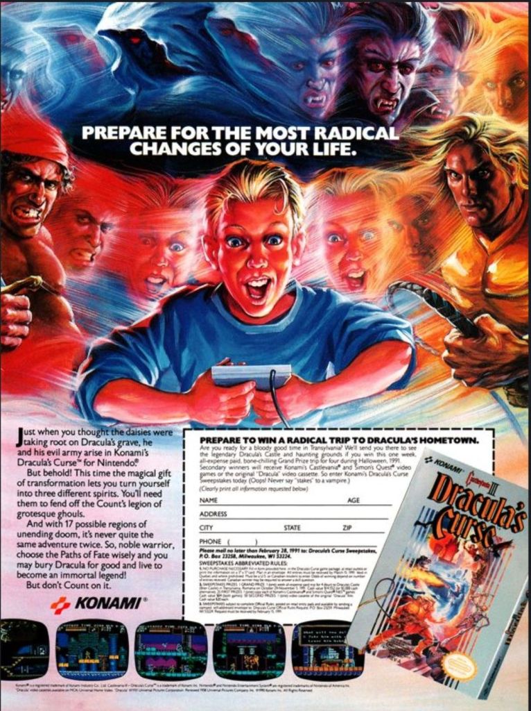 By the year 1990, the Nintendo Entertainment System (NES) was present in several millions of households all over America and there were lots of great games available. Among the NES gamers were fans of the Castlevania game series and Konami went on to release Castlevania III: Dracula’s Curse in America. As part of the company’s aggressive promotion, a single-page ad featuring a detailed looking artwork of a gamer getting immersed with the game’s fantasy elements (look at the creepy looking characters, monsters and the game’s hero present) was done. While the artwork was a strong attention grabber, what stood out was the sweepstakes form for gamers to cut out, fill it with their information and mail it for the chance to win a trip to the hometown of Dracula. Do you personally know anyone who won in the sweepstakes?