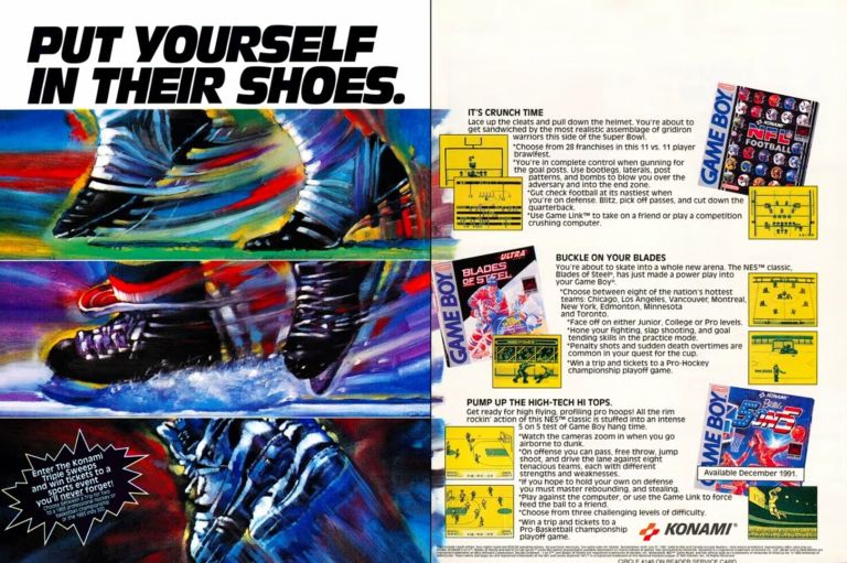 From the mid-1980s to the early 1990s, Konami published a lot of games on Nintendo’s wildly popular platform the NES and among them were classics like Contra, Castlevania and Metal Gear. Konami’s support also made it to Nintendo’s Game Boy handheld device (first released in 1989) which itself sold strongly and became the leading platform for portable gaming. As such, Konami made a 2-page print ad promoting NFL Football, Blades of Steel and Double Dribble: 5 on 5 for Game Boy. Cleverly, the ad makers used fancy artworks on the left (reflecting the different sports) side while using the space on the right side for descriptive text, screenshots and game box covers. This fine looking ad has a strong appeal towards Game Boy users and sports enthusiasts.