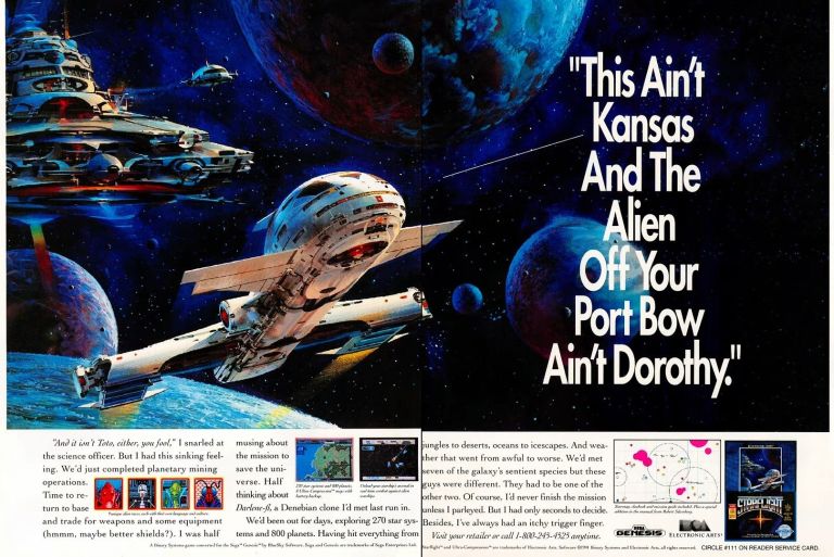 By the time it was released on the Sega Genesis in 1991, Starflight was already popular as it was released on varied computer systems and entertained a lot of gamers several years prior. To promote the Sega Genesis version, a 2-page print ad of Starflight was made with a grand-looking artwork of space, spaceships and planets dominating the space. The ad makers managed to utilize the remaining space below the artwork to show selected images, the descriptive text and the game’s box cover to make it clear to gamers that Starflight on Genesis is real and made to be playable. The artwork itself remains a powerful grabber of attention even to this day.