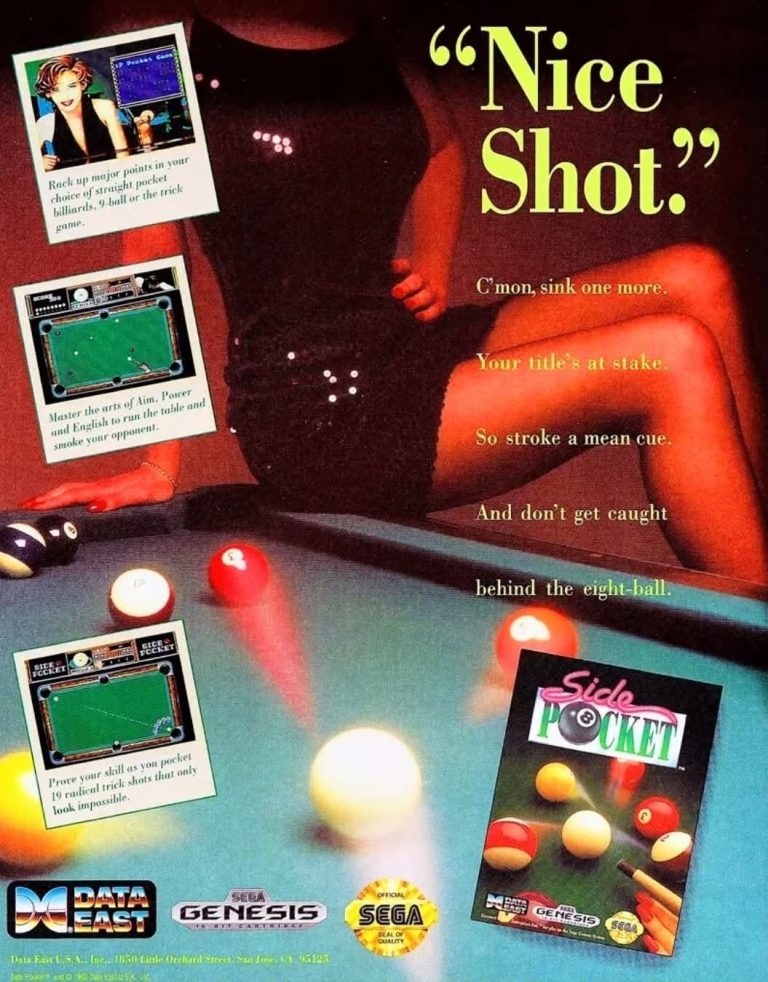 After its original release in the arcades in 1986, Side Pocket was ported by Data East to many consoles and handheld devices in the 1990s. When it comes to promoting the Sega Genesis version, Data East came up with this print ad showing a lady in a sexy dress in the background (head hidden) which instantly created a sexy aesthetic. The large text displayed emphasized the game of billiards supported by the screenshots shown. The screenshot at the upper-left corner shows artwork of a pretty lady smiling at the viewer which added to the sexy aesthetic of the ad.