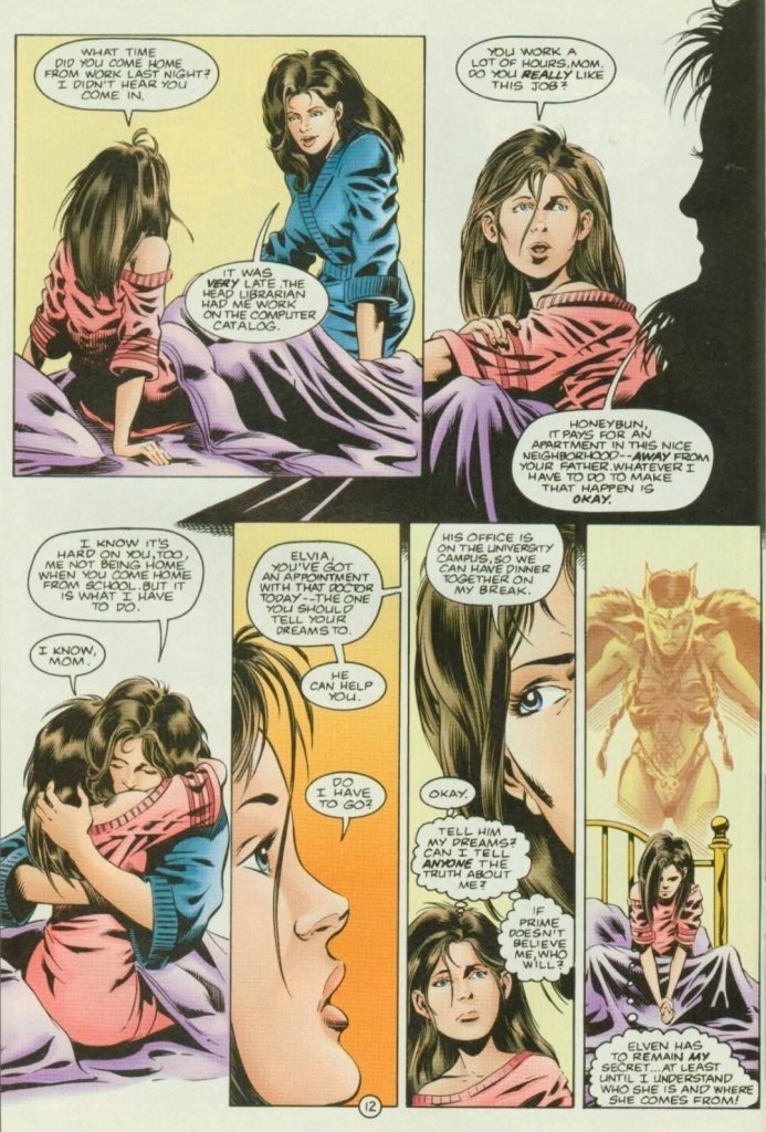 Being written by Prime co-creator and series co-author Len Strazewski, this Ultraverse tale about Elven is very good and there is a lot of depth in the plot. You will meet Elven and the true human behind her named Elvia Swenson, a teenage girl who has a painful past, has an obsession with fantasy tales, and was created through the very same secret government fertility research program as Kevin Green/Prime. Elven’s disturbing look (with elvish features) reflects Elvia’s fantasy obsession and personally belief of using violence against men. She and Prime are genetically related due to the top secret project.