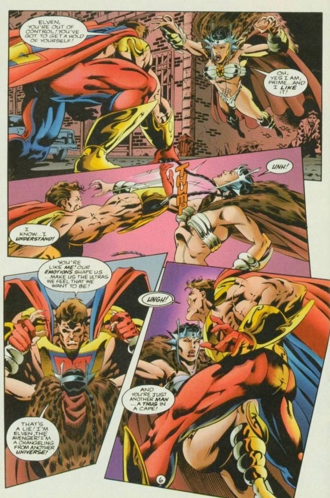 When it comes to Prime himself, this comic book features a really mature portrayal of him. I am talking about the early part of the story when Prime did his best to calm Elven down, restrain her and convince her to think first as a way to prevent her recklessness. Long-time Ultraverse readers should now that Prime is actually teenager Kevin Green inside all that muscle and he often has an awkward or a tense way of communicating with others (note: imagine the teenager pretending to think and act like an adult). That said, Prime here really interacts maturely and his attempt to put a lot of sense into the impulsive Elven is very believable. This is clever writing by Strazewski and it is one of the more notable portrayals of Prime.