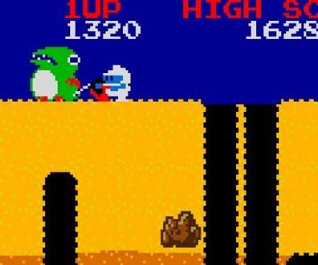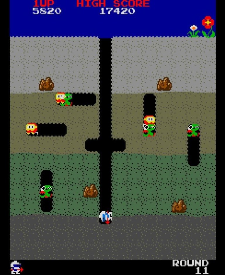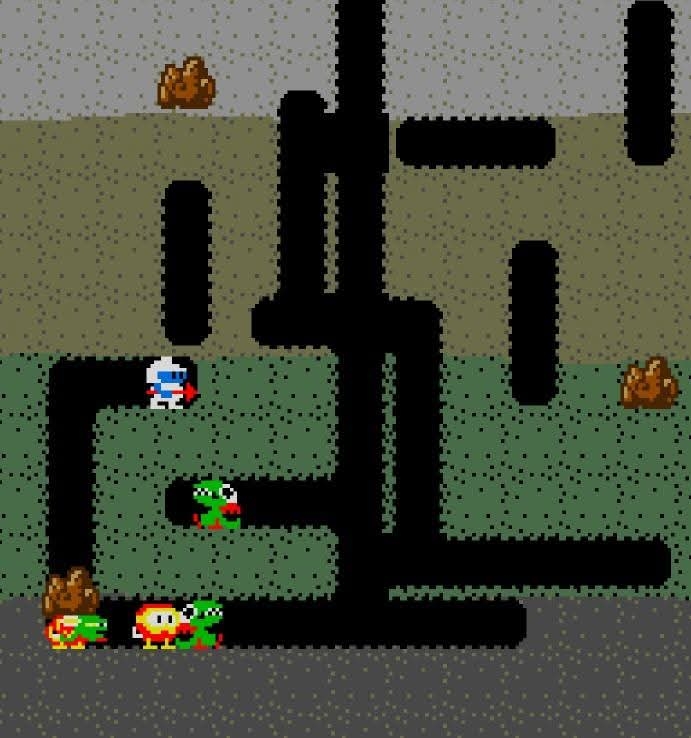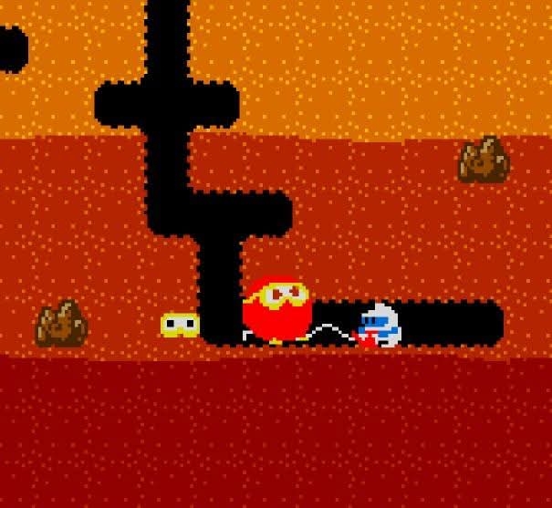 As you inflate an enemy and there are still more enemies near you, you have to be mindful that a Pooka can penetrate through the soil and emerge in a tunnel near you.
