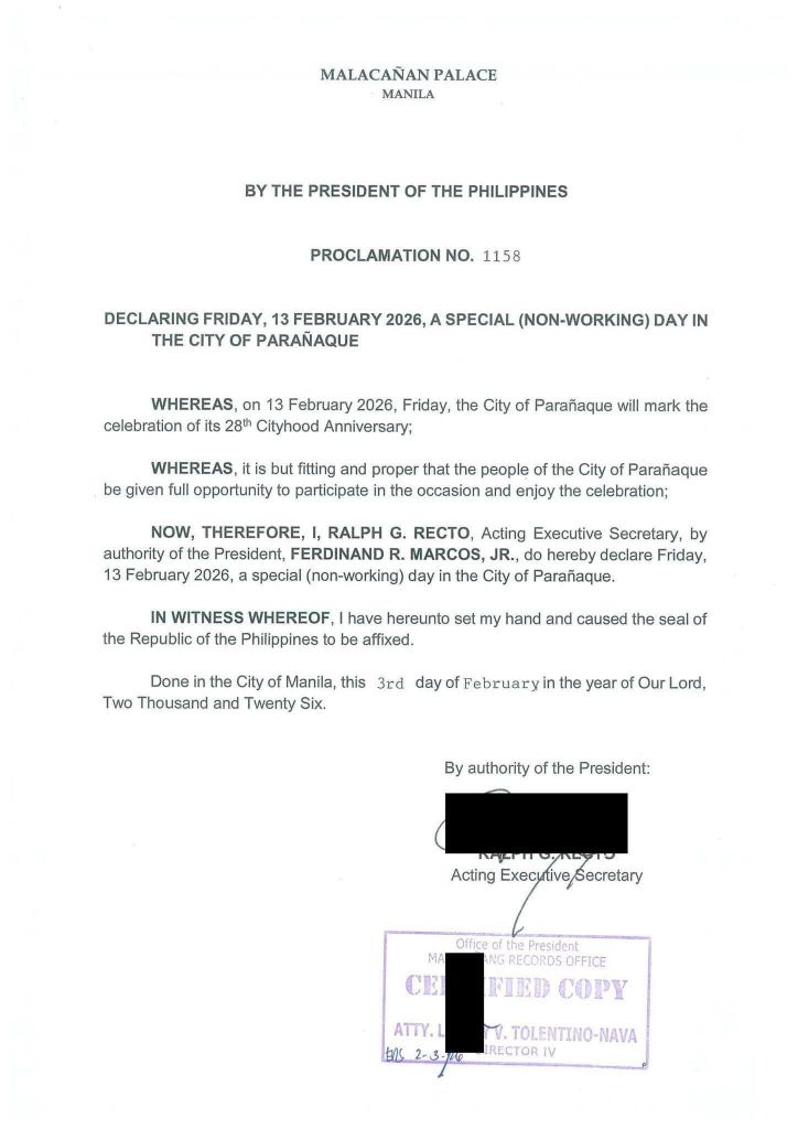 Proclamation Number 1158 declared February 13, 2026 a special non-working day in Parañaque City.