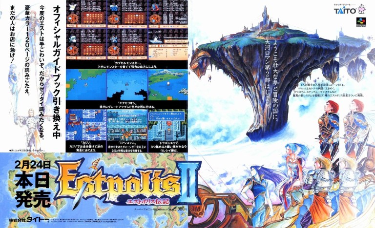 When Estopolis Denki was released on the Super Famicom in Japan, sold enough copies to justify not only bringing the game to Western markets as Lufia & The Fortress of Doom but also the production of a follow-up titled Estopolis Denki II. To promote it, Taito made a Japanese print ad that had a captivating art style (with the characters looking more realistic and a floating land that had a gritty touch), some screenshots and the promise of fantastic adventures. While the game’s title sounded like a sequel, its story was actually set in the past. Estopolis Denki II would be released in the West as Lufia II: Rise of the Sinistrals.