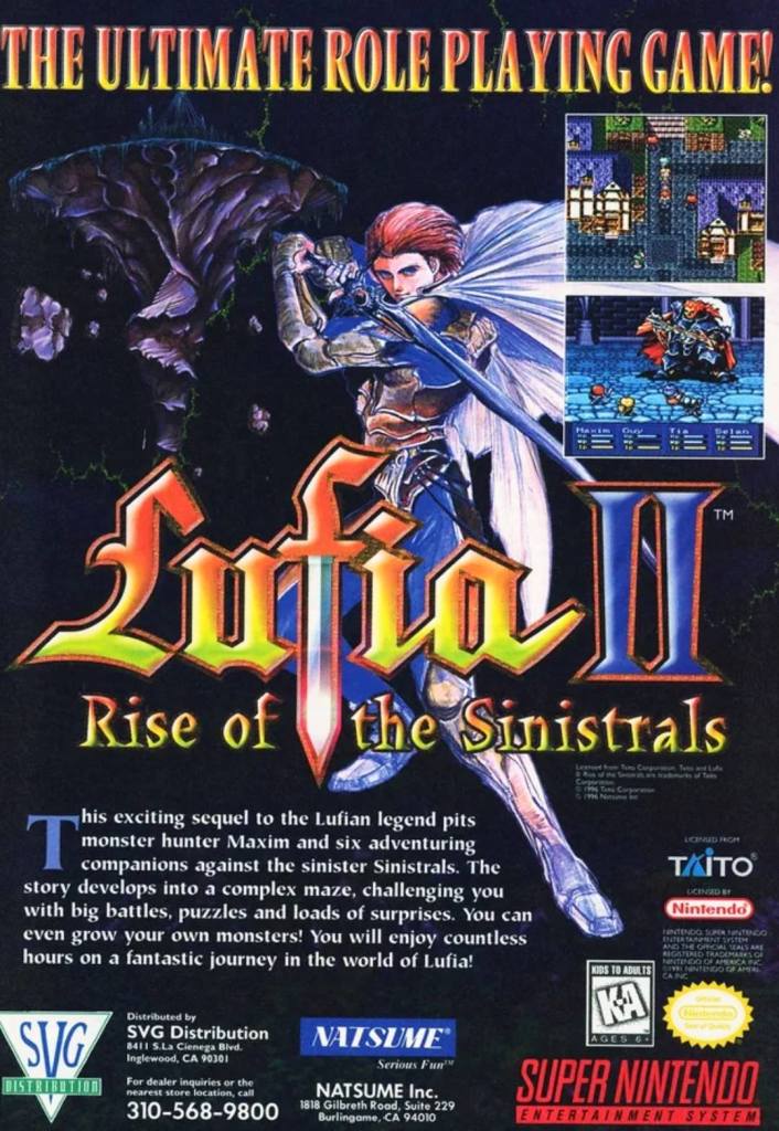 When the first Lufia RPG was released in America on the Super Nintendo Entertainment System (SNES), it became a commercial hit finishing as the top SNES game in the February 1994 sales chart. The sequel Lufia II: Rise of the Sinistrals was published by Natsume in America in 1996 and they daringly called it “The Ultimate Role Playing Game!” in its print ad utilizing the official artwork of a major character, two screenshots and descriptive text giving readers an idea on what to expect. This ad strongly relied on the visual elements while the first game’s American print ad (made by Taito) emphasized the critical acclaim received.