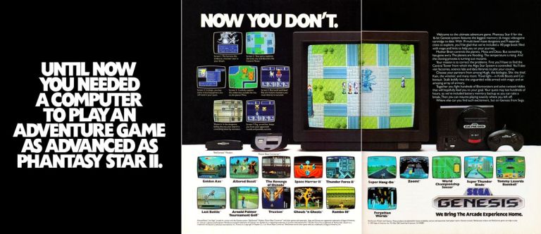 After selling a good amount of copies of the original Phantasy Star worldwide on the Sega Master System, Sega knew they were on to something. They confidently produced the sequel Phantasy Star II for their brand-new Sega Genesis console in 1989 and aggressively promoted it in America with a daring 3-page print ad. If you look closely, majority of two of the pages were used to promote Phantasy Star II with screenshots (including a big one with a TV), the text description and the console. The spaces below allowed Sega to promote their many other games in convenient fashion. The result is huge success for Sega as more than 1.6 million copies of Phantasy Star II were sold worldwide. Sega would go on to make even more Phantasy Star games.