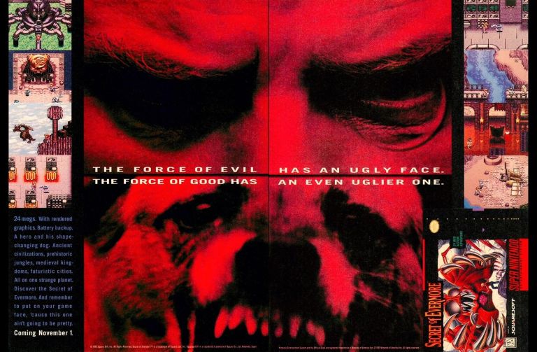 Still in 1995, Square released Secret of Evermore for the SNES. Unlike most of Square’s RPGs, Secret of Evermore was developed by an American team in Washington state which explains why the game has a very distinct tone and strongly Western art style (note: the gameplay was patterned after that of Secret of Mana). To promote the game, Square came up with a very odd-looking 2-page print ad that had two dominating red images – eyes of a man on top and the front of a dog below) that felt like a forced approach to emphasize the game’s concept of the hero (a teenager boy) and his loyal dog (a very capable fighter). They used the remaining space for screenshots (which made gamers believe it was a sequel to Secret of Mana), the game box cover and a not so helpful text description. In my view, this print ad was a marketing misfire and Square could have produced hand-drawn art of the hero and his dog instead of the creepy red pictures.