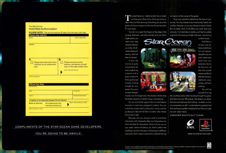 The Star Ocean JRPG franchise of Enix had its first game released in Japan only. That first game on Super Famicom sold a lot of copies which led to the production of the sequel Star Ocean: The Second Story. By the late 1990s, Enix itself had a partnership with developer tri-Ace on the Star Ocean games. Somewhere along the way, Sony Computer Entertainment America (SCEA) secured the publishing rights of Star Ocean: The Second Story for not only America but also in other parts of the world. For the American market, Sony came up with a very odd-looking 2-page print ad that had a mail service form on the left. The form emphasized the concept of being away for a long time (reflecting the science fiction and extensive fantasy adventuring of the game itself) which incidentally was the eye-catcher of the ad. The other half of the page showing the game’s title, screenshots and detailed text description got overshadowed. This is another marketing misfire.