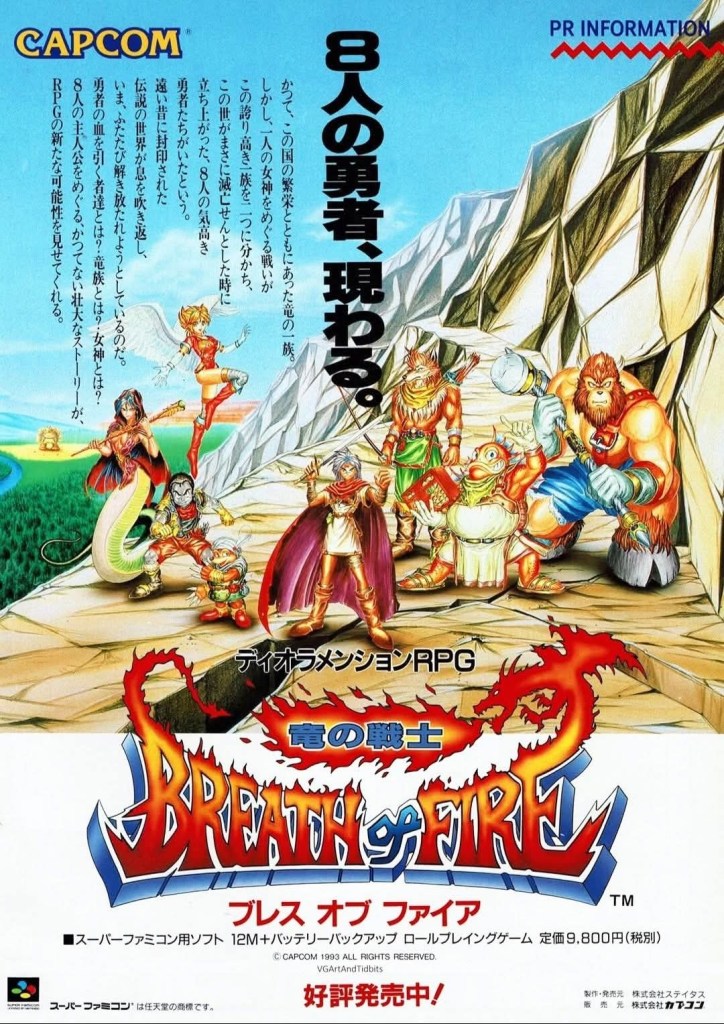 In 1993, Capcom officially broke into the Japanese role-playing game (JRPG) genre with Breath of Fire on the Super Family Computer (Super Famicom). The print ad they came up with for the Japanese market showed several characters – including Ryu and Nina who would later become recurring characters as sequels were released – with designs that had elements of anime and manga styles blended which contrasted the gritty and realistic approach of Western fantasy art. The ad made it clear to readers that new adventures in a fantastic world await them. The game achieved enough commercial success in Japan which convinced Capcom to make a sequel (plus more in the years that followed).