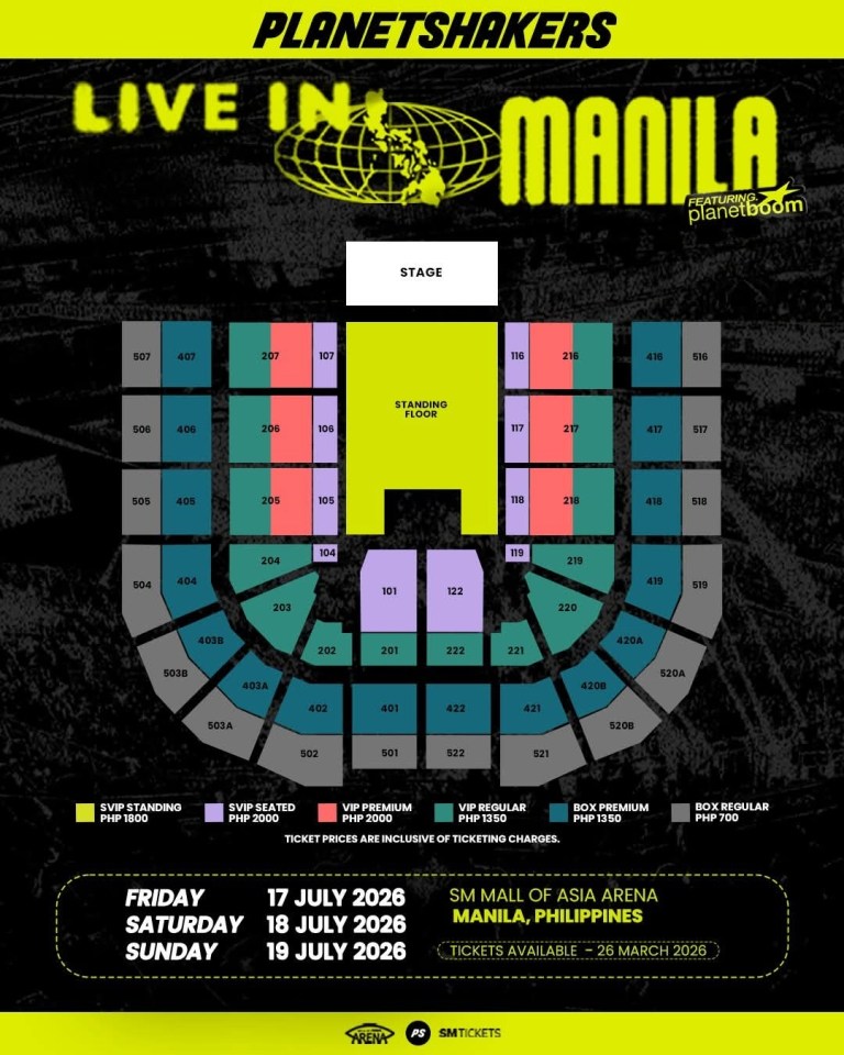 In its official announcement via social media, Planetshakers Live In Manila Featuring Planetboom will be held at the SM Mall of Asia Arena on the evenings of July 17 to 19, 2026. Tickets for the worship events will become available on March 26 via SM Tickets. For the official layout and ticket prices, look closely at the image below.