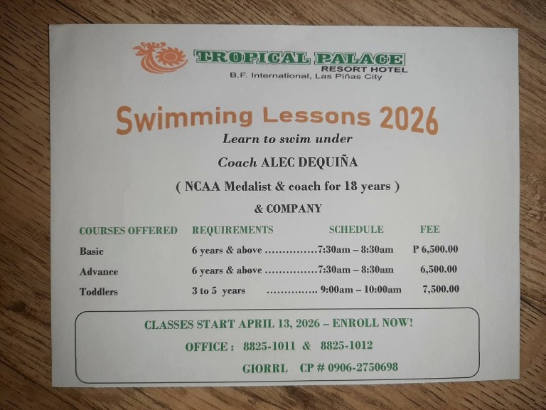 The Summer Swimming Lessons 2026 program at Tropical Palace Resort Hotel in BF International, Las Piñas City officially begins today.