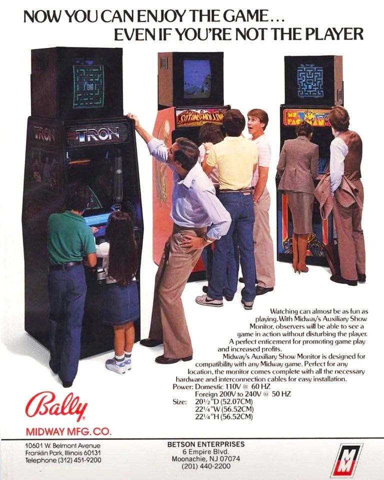 As video arcades in America became massively popular with people and became a major economic sector, it was not surprising that crowding became a trend especially whenever a very popular game attracted both players (waiting in line) as well as onlookers. Midway, which was an arcade giant in the 1980s, came up with their own concept of a specialized secondary display called the Midway Auxiliary Show Monitor designed to let onlookers watch a video of ongoing gameplay without physically standing by the player. As the print ad above shows precisely the use of the monitors, those were used at trade shows or in arcades with a setup to make turn the single-player experience into a makeshift show for the people nearby. Back in the 1980s, there was indeed a spectator approach to the arcade experience but players had to deal with the disturbance of many onlookers standing near to see the on-screen action. At the very least, Midway’s concept and hardware was a bold attempt to solve overcrowding.