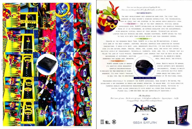 If there is anything notable about the history of the Sega Saturn, it is the fact that there were no new dedicated platform games of Sonic The Hedgehog released for it which is very odd as the Sonic platform games on Sega Genesis were big sellers, critically acclaimed and even made their mark on pop culture. During the mid-1990s, Sonic Team (which had Sonic game creators like Yuji Naka and Naoto Ohshima) were laser-focused on making Nights into Dreams (stylized as NiGHTS into Dreams) which was an all-new intellectual property that allowed them to utilize the 3D capabilities of the Saturn while making room for their creativity. Sega knew Nights into Dreams was special so they came up with this 2-page print ad which had an eye-catching display of screenshots of the game on the left (with the Saturn in the middle) while using the other half for descriptive text and explanations (with the special Saturn controller in the middle) to grab people’s attention. This old ad from 1996 is a mixed bag for me as the left side was captivating to see while the description on the right side requires some effort to read properly due to the small size of the text.