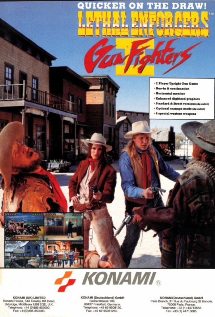 After achieving both critical and big-time commercial arcade success with Lethal Enforcers in 1992, Konami proceeded with the sequel Lethal Enforcers II: Gun Fighters which was released in arcades two years later. While the 1994 game used 2D sprites and digitized photographs like its predecessor, Konami used the 19th century Old West as the setting making it totally different from the 1992 original. To promote the game and emphasize the Old West setting, Konami came up with this arcade flyer that showed actors in cowboy costumes with a background that looks like a cowboy movie set. Lethal Enforcers II: Gun Fighters went on to become successful in the arcades and it later got ported to game consoles.