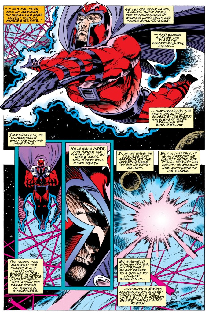 The story begins with the United Nations Security Council’s approval to initiate the alpha and beta parameters of the Magneto Protocols which literally sent waves from the White House to the Kremlin. A short time later, several satellites orbiting the Earth activate and linked with each other to form a protective mesh of electro-magnetic fire. This provokes Magneto (accompanied by Acolytes and Exodus at Avalon) to react by generating a massive pulse wave that affects the entire world. Even the Fantastic Four and Excalibur were not spared.