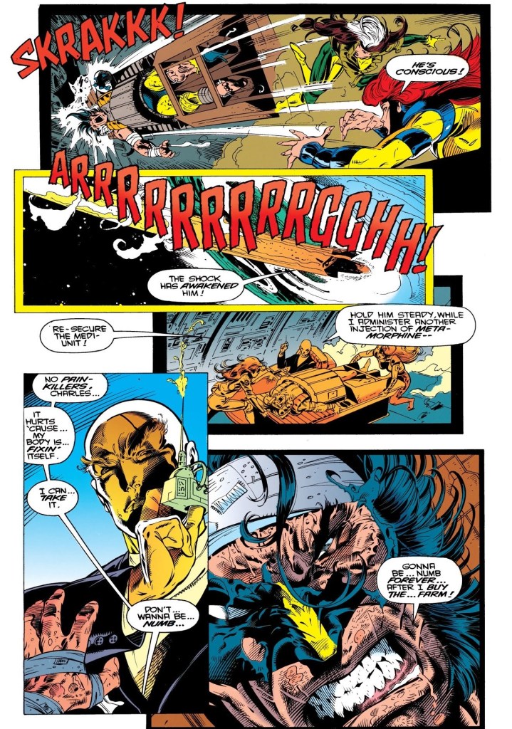 To be clear, this story continues the events of Fatal Attractions but with a bit more focus on Wolverine (compared to the earlier chapters of the storyline that is). There is no real battle between good and evil at all. It’s really all about Wolverine struggling to survive just as his teammates struggle to arrive home.