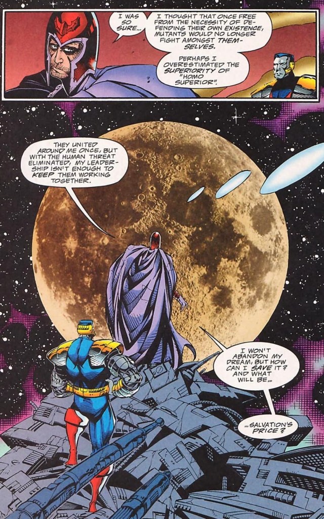 The story begins inside Avalon with Magneto and Colossus watching recorded footage of Charles Xavier announcing his decision to stop opposing the ascension of Avalon. It turns out, Xavier’s decision paved the way for mutants to relocate to Avalon (orbiting Earth) in return for assurance that those who remain in it will do so unmolested. With the intention to let Avalon’s residents achieve their full and glorious potential, Magneto allowed the mutants to rule themselves without any dictatorship by him.