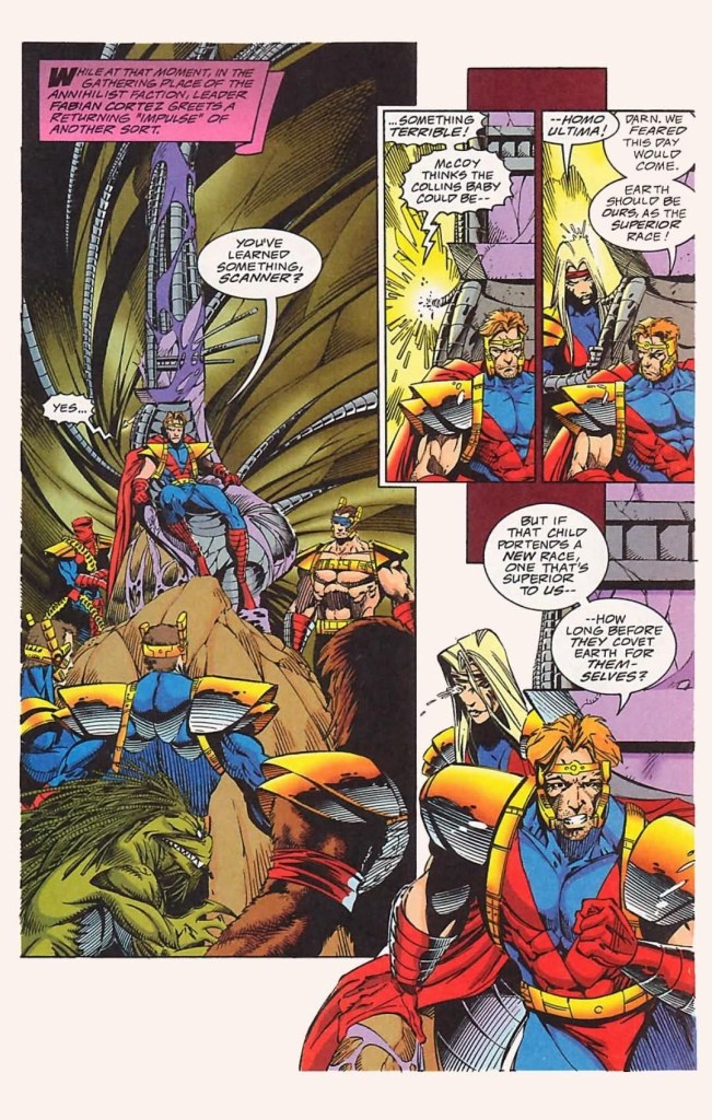 What I like most about this What If tale is its core concept exploring what would have happened had Magneto ruled the mutants specifically those living in his own realm (Avalon). Writer David Michelinie (best known for writing Amazing Spider-Man stories) wrote a really inspired script that emphasized Magneto’s vision of mutant utopia isolated from the twisted and complicated societies of Earth (which still has lots of people who are afraid of and hostile towards mutants) while leaving room for conflict in the form of ideological division between mutants on Avalon. As the growing division and violence are shattering Magneto’s vision of mutant utopia, the birth of an infant whose presence adds to the tension and fear of Avalon’s inhabitants.