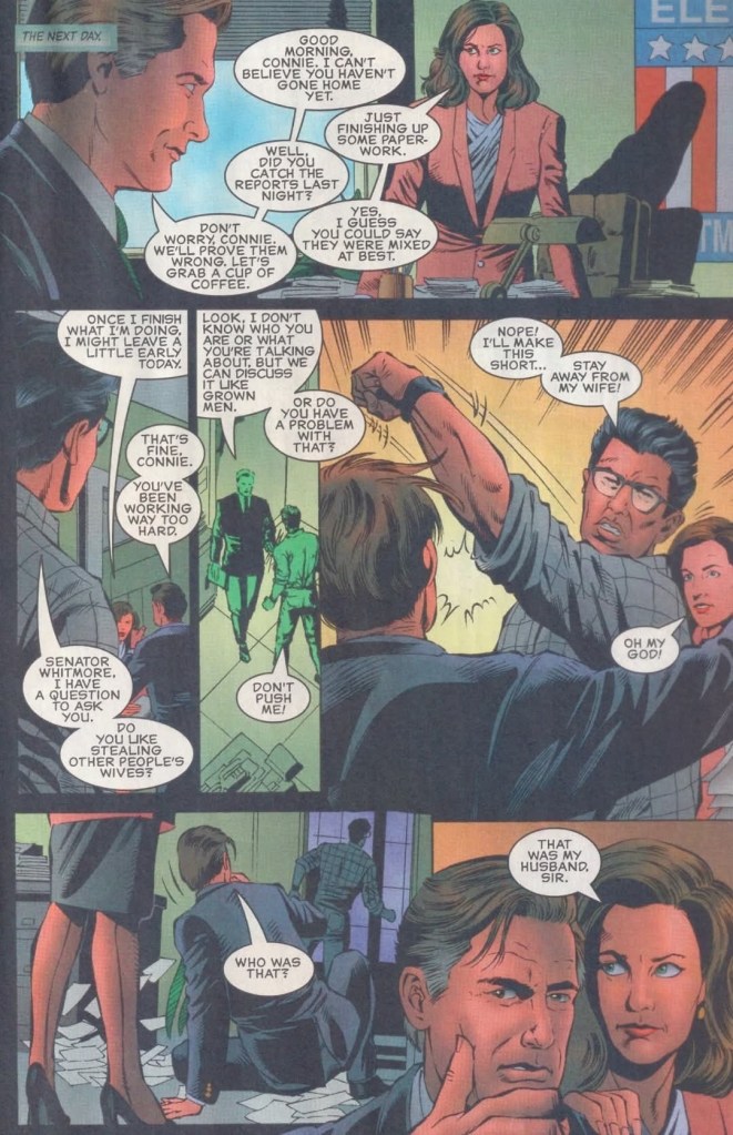 As this comic book involved multiple artists, it should not be a surprise that the result is of varying quality from one scene to another. In fairness, the illustrator (or illustrators) who drew the Area 51 scenes and the crashed alien ship did a good job with the details. As for the characters, pilot Steven Hiller resembled Will Smith enough, and the same can be said about Thomas Whitmore somewhat looking like Bill Pullman, David Levinson looking somewhat like Jeff Goldblum, and General Grey slightly looking like Robert Loggia. Meanwhile, Constance Pano resembled Margaret Colin more while the 1990s Dr. Okun resembled Brent Spiner in a few shots.