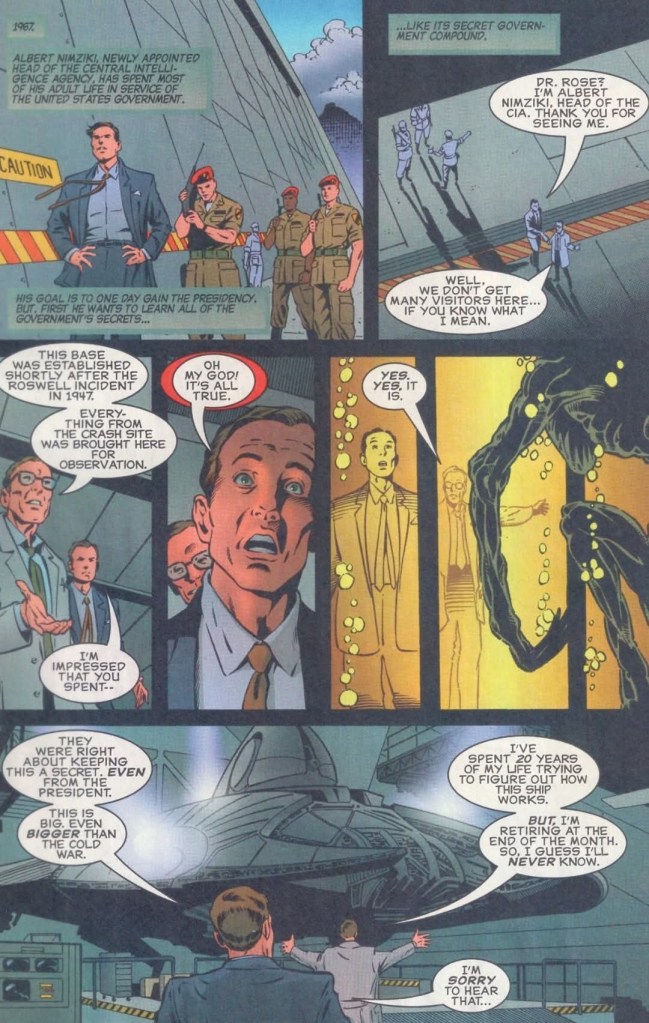 As described above, this prequel comic book visually dramatizes the past events that were only mentioned in the movie particularly with regards to the Roswell UFO incident as well as Area 51 and how the government handled findings about aliens from outer space. In fact, the story here was scripted to move from one significant event to the next through the decades, and the good news here is that the exposition is not too heavy (when compared to Jurassic Park comic books of 1993) and the pacing moved at a medium pace. The result is a reading experience that is intriguing and entertaining.