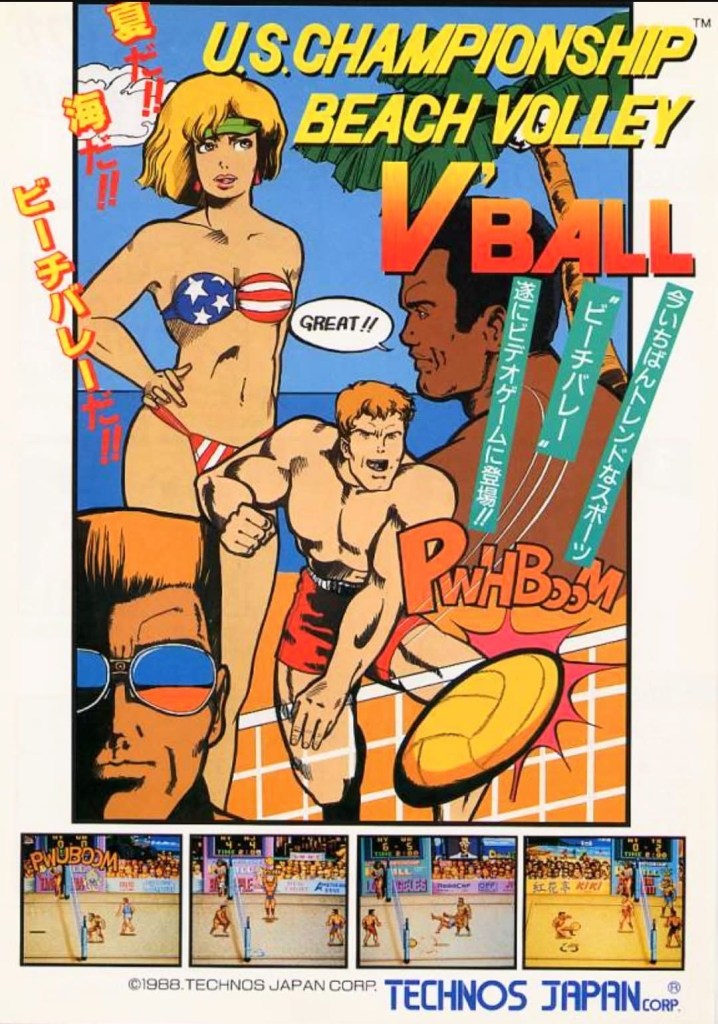 In 1988, Technos – the company behind the Double Dragon video games – released U.S. Championship V’Ball in video arcades in Japan and in America. The way it was promoted in Japan, Technos came up with an arcade flyer that had a comic-inspired hand-drawn artwork that easily gave viewers a strong American beach volleyball vibe. For the American arcade market, Taito (licensed by Technos) used different artwork showing two men in action. If you ask me, the Japanese arcade flyer is more dynamic to look at. Regardless of art style and presentation, both arcade flyers emphasized beach volleyball to gamers clearly.