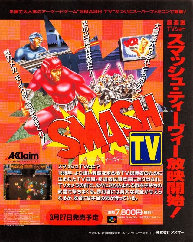 Yes, it is true! The console port of the arcade classic Smash T.V. was released on the Super Family Computer (Super Famicom) in Japan back in the 1990s. While I cannot understand the Japanese text shown on the ad above, it still looks exciting as the official artwork plus a screenshot of the game were displayed. The revealed retail price of 7,800 Yen is alone eye-catching as there were many games in Japan launched below that price in the next console generation. I can only wonder how many gamers in Japan bought and enjoyed Smash T.V.