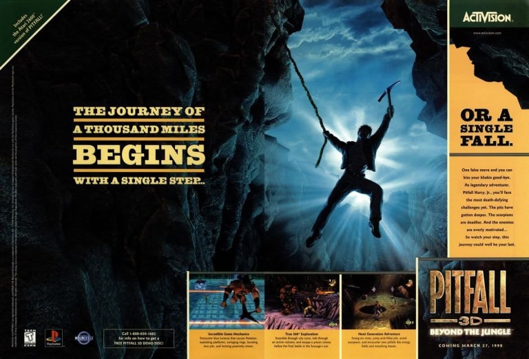 When Activision decide to make a new Pitfall video game with polygonal graphics and with 3D platform gameplay, it was not surprising at all as this was the trend that defined 1990s gaming. In 1998, Pitfall 3D: Beyond the Jungle was released for the PlayStation and it received a divisive reception from the critics. If you look closely at the print ad, the words “Next Generation Adventure” was written in the lower-right part and it was clear the game’s quality did not justify them.