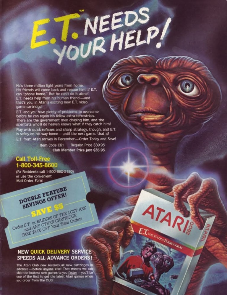 Atari invested a lot on its video game based on Steven Spielberg’s E.T. the Extra-Terrestrial as the film was a massive box office success. In addition to their Atari 2600 video game print ad showing E.T. with Elliot, they ran another print ad with a concept of the sci-fi character needing people’s help. They came up with original artwork showing E.T. holding a box of the Atari 2600 E.T. video game, then posted details about how to acquire a copy of the game (with prices for regular customers and club members) and posted a toll-free 1-800 phone number. They also offered a $5 discount for those who order the E.T. or Raider of the Lost Ark video game and another cartridge. This old ad had commerce written all over it.