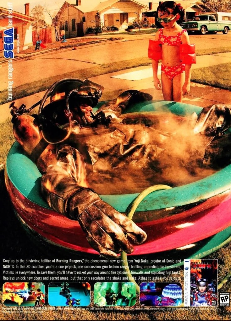 Released in 1998 for the Sega Saturn, Burning Rangers was a high-quality exclusive game. To promote it in America, Sega came up with the print ad showing a few screenshots and a dominating image of a fire fighter cooling down on a kid’s personal pool. The image emphasized the element of fire in the game even though it lacked the more sci-fi elements used on the characters and setting. It should be noted that by 1998, the Sega Saturn was no longer in high demand in America as gamers overwhelmingly chose PlayStation and Nintendo 64 (N64) consoles and games. In retrospect, this was one of Sega’s final hard marketing moves done with a Saturn game.