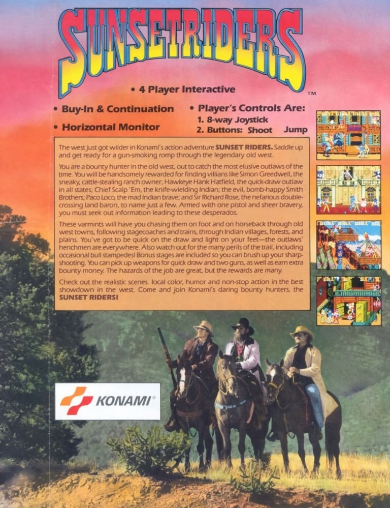 Released in arcades in 1991, Sunset Riders was a critical and commercial hit raking in more success to Konami. For the American arcades, Konami came up with this print ad showing a creepy looking cowboy carrying a bag of money (related to the “strike it rich” line) with his donkey with him. The rear of the ad shows another photograph of 3 cowboys on their horses, the four screenshots and the creative text description. Too bad we don’t see flyers like this anymore.