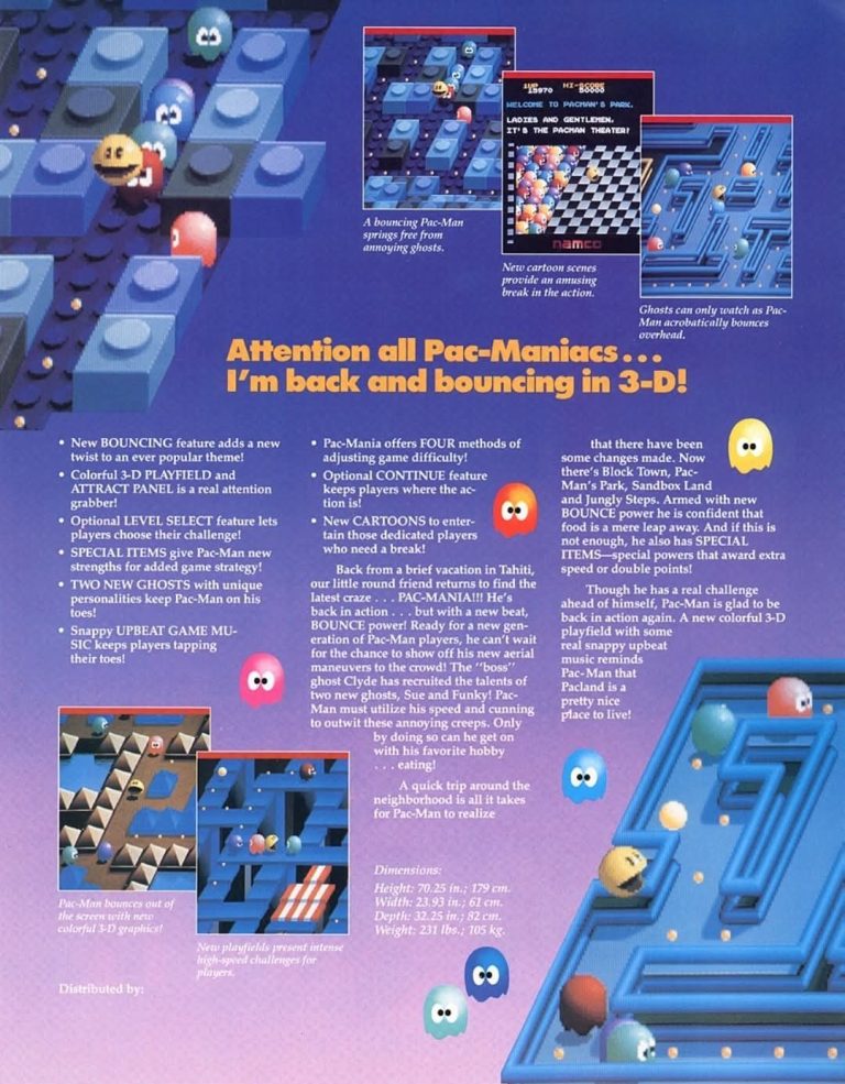 Released in 1987, Pac-Mania became a big hit among critics, fans and casual arcade gamers which added a lot to the enduring popularity of the Pac-Man game franchise. As it featured a new game design with an oblique perspective and a more 3D feel, Pac-Mania was a very serious attempt on reinventing the Pac-Man formula. For the American market, Namco licensed the game to Atari which in turn came up with the above arcade flyer that had a pretty eye-catching front cover artwork showcasing the iconic Pac-Man jumping out from a maze with the line “I’m back,…and bouncing.” The arcade cabinet was also shown and a clear message about the 3D feature of the game was shown. The other side of the flyer showed screenshots and details that are worth reading. This arcade flyer still looks attractive and informative by today’s standards.