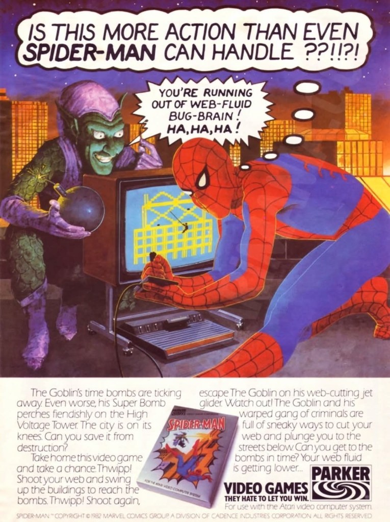 Even though the controls were rough and the game’s difficulty really went high with each new session, my friends and I still enjoyed playing the Spider-Man video game on Atari 2600 from Parker Brothers. Apart from the comic book-style print ads they came up with to promote the game, Parker Brothers went on to make this particular ad featuring Spider-Man and the Green Goblin with a TV set, the game and the Atari 2600 together all presented with a totally different art style. This is still a fun ad to look at.