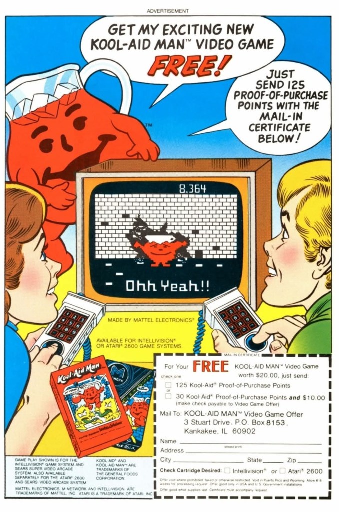 There was a time when Kool-Aid was such a popular drink, the character Kool-Aid Man debuted in 1974 after initially starting as the Pitcher Man. A short time later, merchandising featuring the character followed and in 1983 the official Kool-Aid Man video game was released on the Atari 2600 and the Intellivision. This particular print ad appeared in some comic books I read a very long time ago and it offered customers the opportunity to get the game free by sending 125 proof-of-purchase points to the company by mail. This old ad was visually striking and was a creative way to boost sales of the drink.