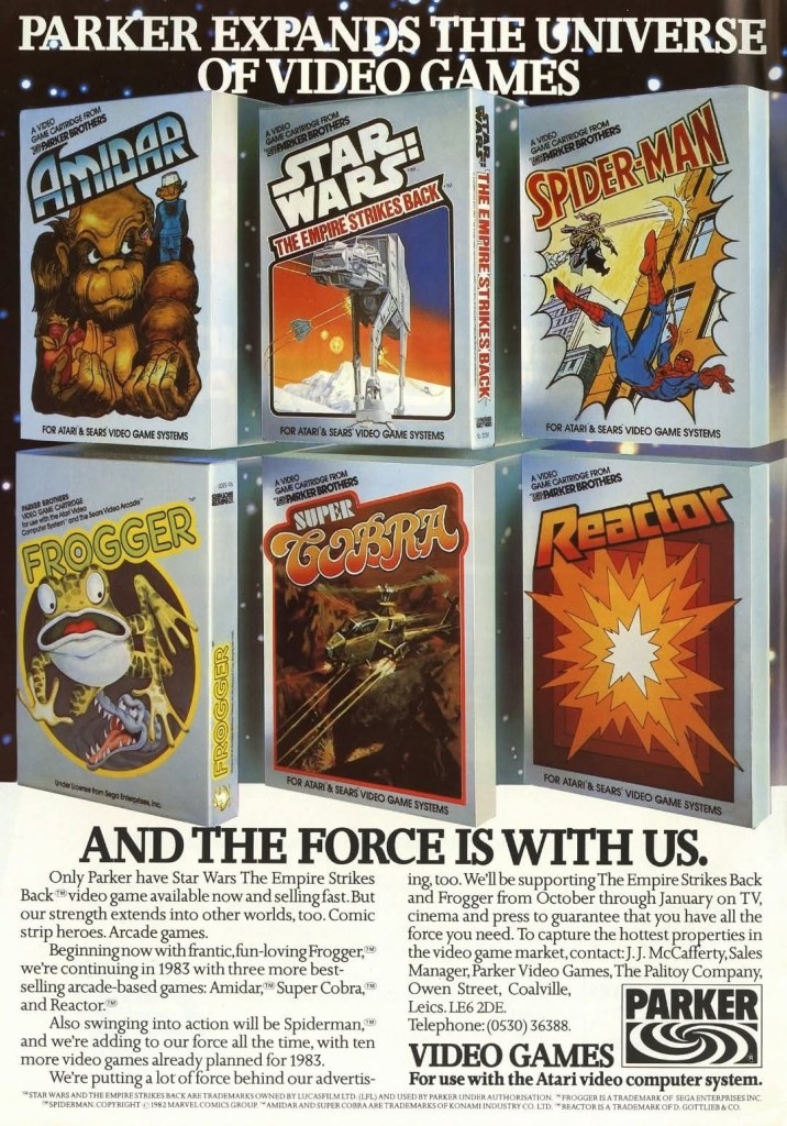 Quite arguably, Parker Brothers was the 2nd most prominent publisher of video games on the Atari 2600 console next to Atari itself. Out of the six games presented in this old print ad, I only played Spider-Man and Super Cobra. Each game’s box had a unique art style and collectively they made this ad look exciting. Times were really different back in the 1980s.