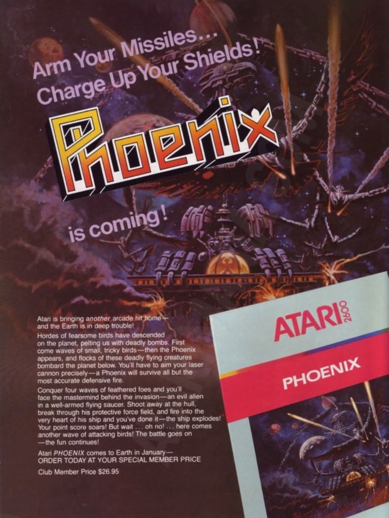 After playing shooter-type games like Space Invaders and Centipede on the Atari 2600, my friends and I experienced something familiar yet fresh with Phoenix. Atari secured from Taito the rights to make the Atari 2600 port of the game, and they came up with a dark print ad that showcased the official painted art work, a portion of the video game’s box and the line “Arm Your Missiles…Charge Up Your Shields! Phoenix is coming!” Having played the game many times, those highlighted words really captured the essence of Phoenix gameplay.