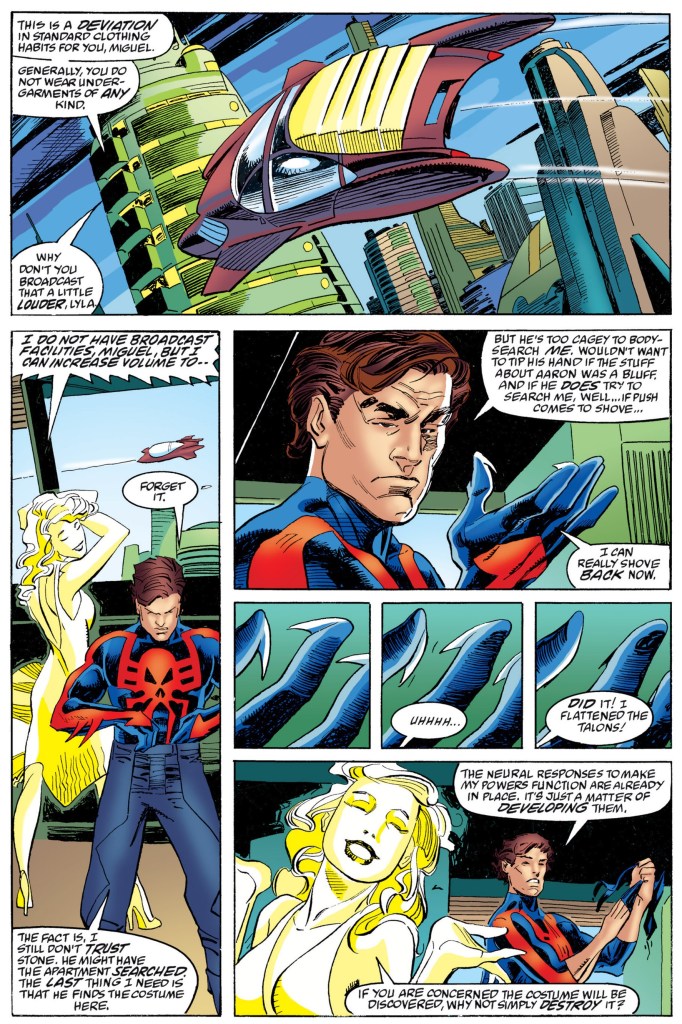 Over at the Babylon Towers residence, Miguel O’Hara gets visited by his boss Tyler Stone accompanied by armed personnel. Not realizing that Spider-Man 2099 and Miguel are one and the same person, Tyler tells him that the sudden appearance of the crawler put Alchemax on edge.